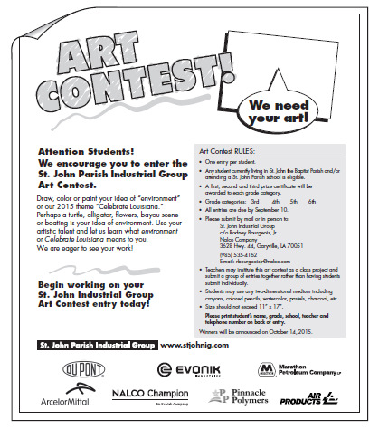 2015 Art Contest Entries due September 10, 2015 and open to 3rd - 6th grade students in St. John the Baptist Parish. Download a PDF of the ad.